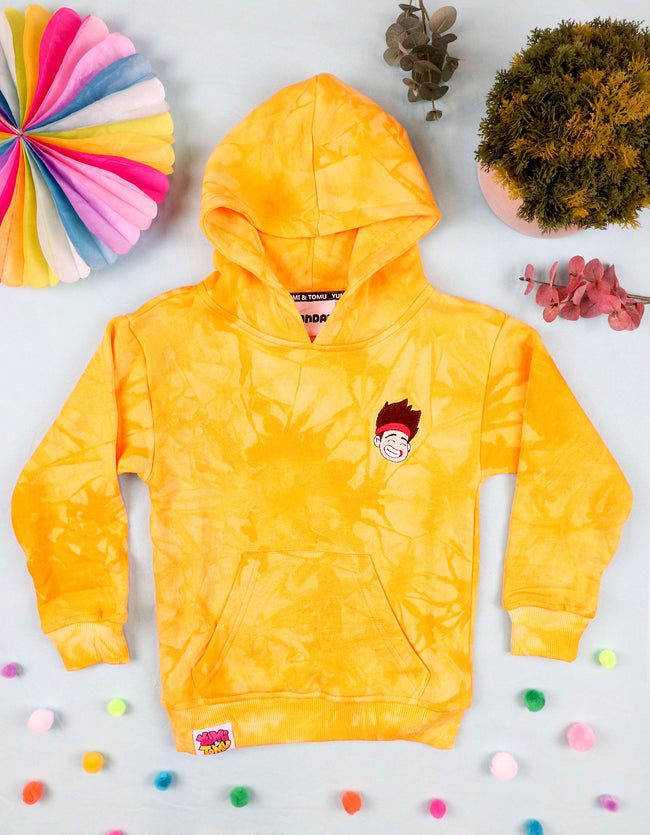 Rackarns bananer vad roligt! Tomus gula luvtröja i tie dye! Den gula luvtröjan passar bäst ihop med vår matchande byxa