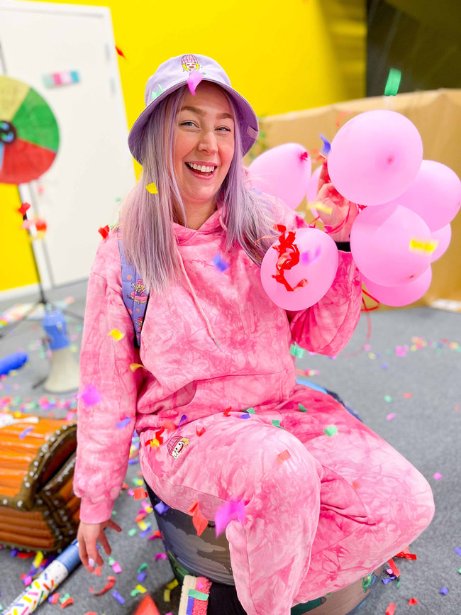 Yumis rosa luvtröja i tie dye! Denna rosa tie dye luvtröjan passar bäst ihop med våra matchande byxor.
